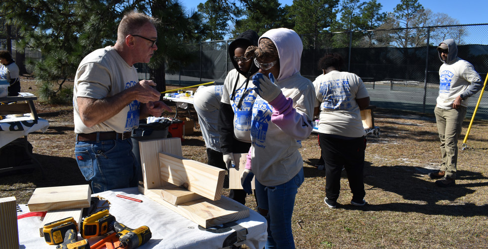 As we traveled to schools and met each CTE facilitator, Brigitte Anderson of Pine Forest, greeted us with eleven students, the MAJORITY BEING FEMALES. She wanted to recruit young ladies because she didn't want them to think they couldn't do this. Sharing a table with sisters Hailei and Ashanti, Ms. Anderson fed off the positive energy they displayed during the entire build. Ashanti and her leadership qualities joked with Ms. Anderson about how to use a drill the proper way, and how FAHFH COO, Rick taught them. The encouragement and humor from Hailei and Ashanti remind our staff why we do this.